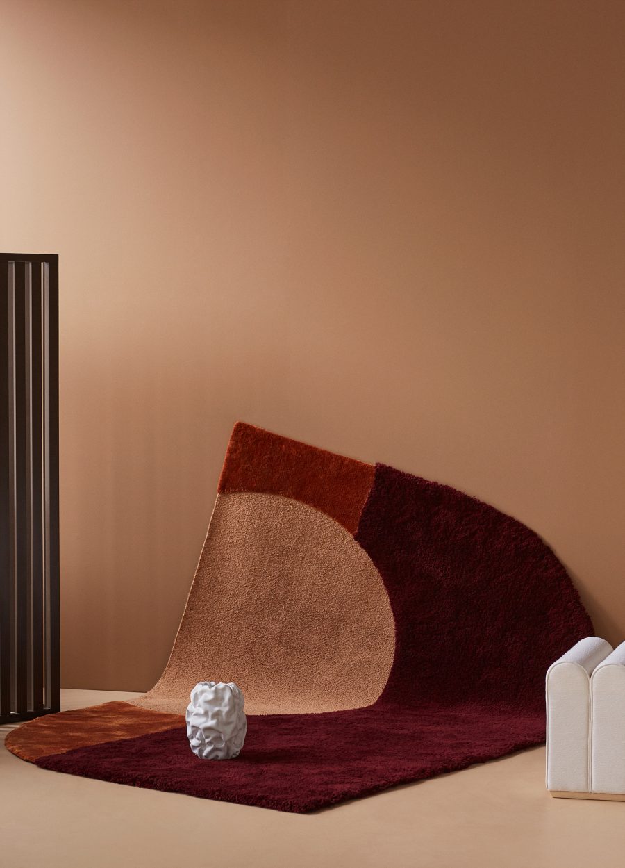 Note Design Studio has created an exclusive collection of rugs with bold expressions that each stand out as pieces of art and the combination of round edges and straight lines makes it an easy to place solitaire.