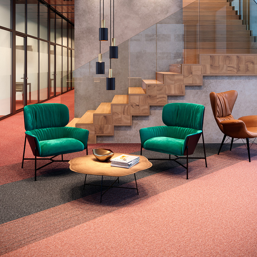 Auxiliary från Shaw är en textil platta inspirerad av naturen och dess skiftningar. Kollektionen består av tre variationer; enfärgad melerad, melerad med svag randning samt melerad med svag randning i gradient. Dessa tre går fint att kombinera för att skapa olika typer av ytor och rum.