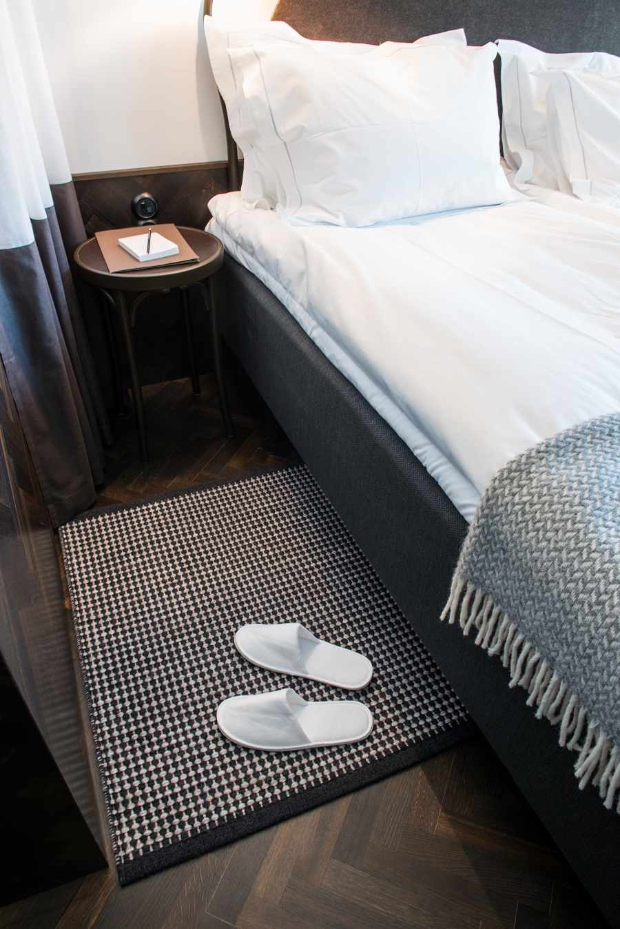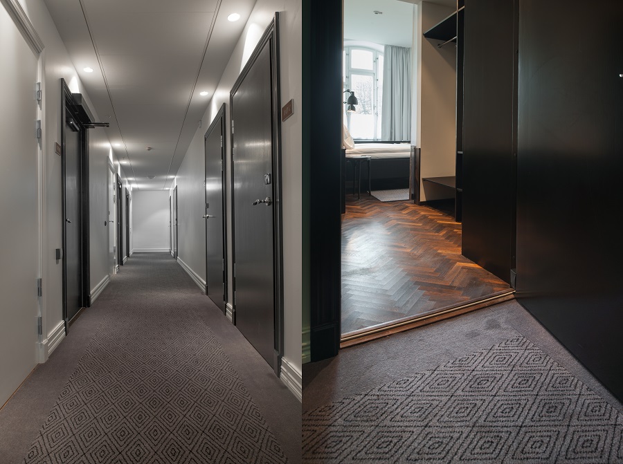 I de 92 hotellrummen ligger de handvävda mattorna Siv, Dag, Mars och Ariel i samma kulör men i olika mönster.