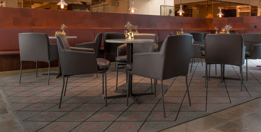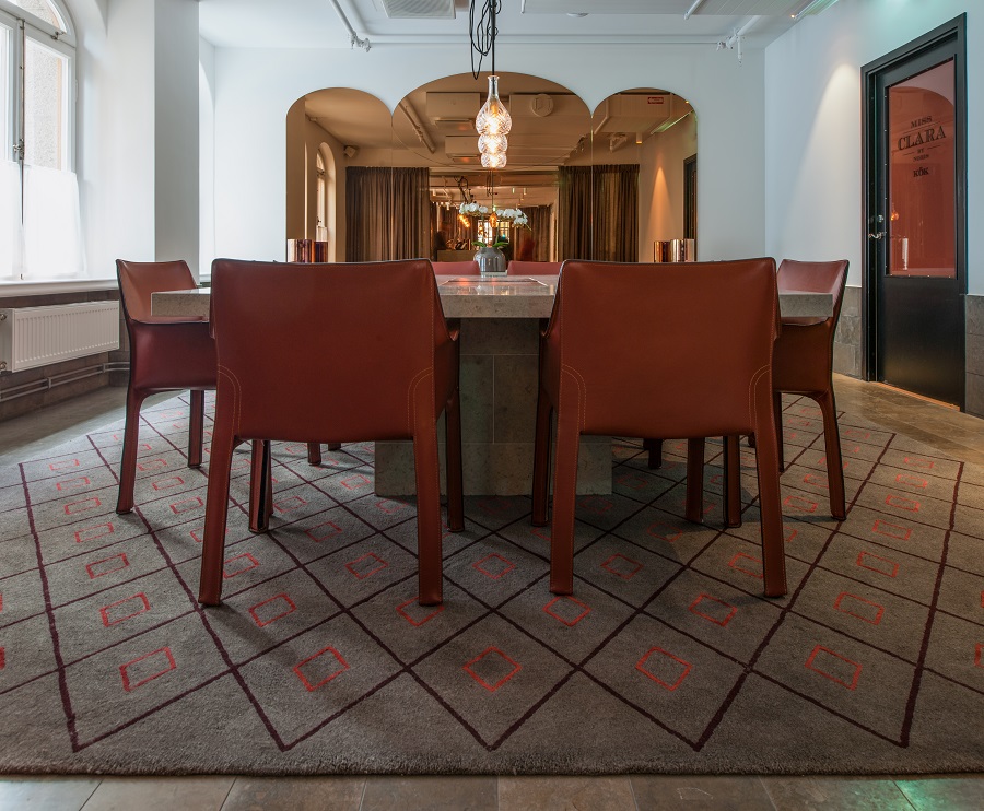 Sara Helder har designat Axminster-mattan i 80 % ull och 20 % nylon som ligger i korridorerna. Designen och färgen är speciellt framtagen för projektet.