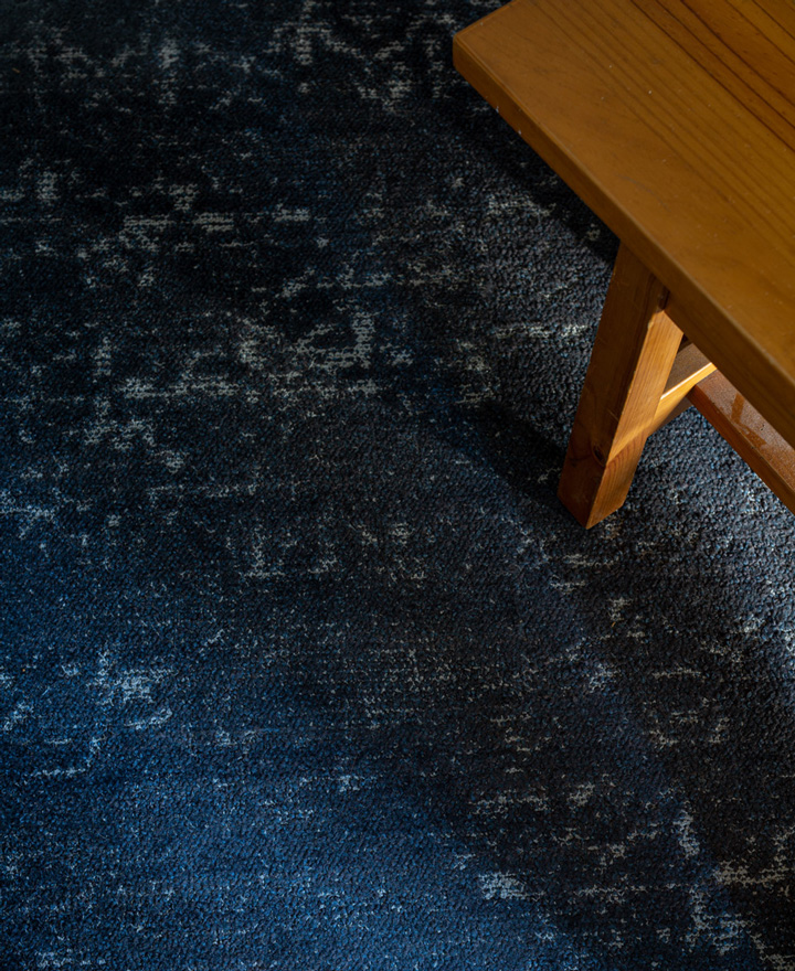 I provrummen ligger textila plattor från kollektionen Modern Edit Ornate 5T166, i kulör 64481 Heritage Blue och ute i butiken ligger en handvävd matta från kollektionen Ask i en specialfärg som är framtagen för butiken.