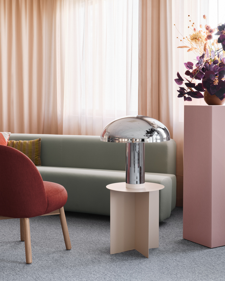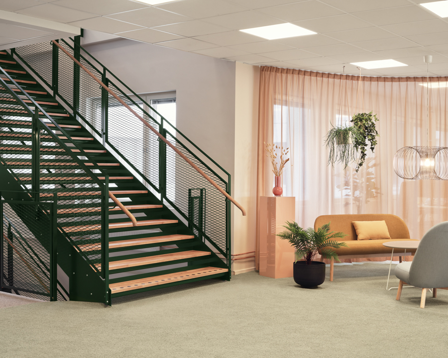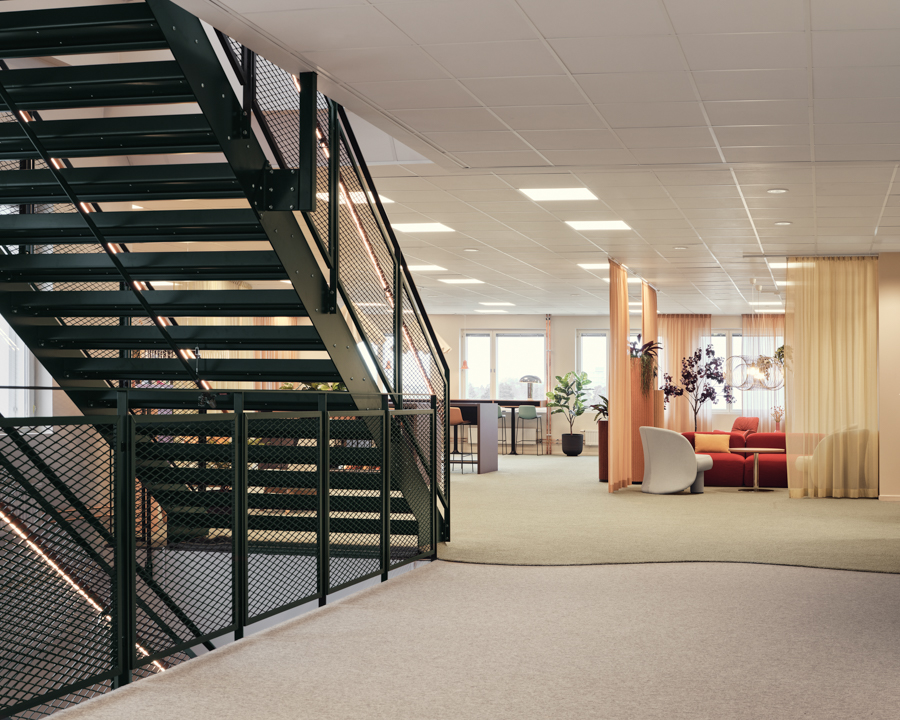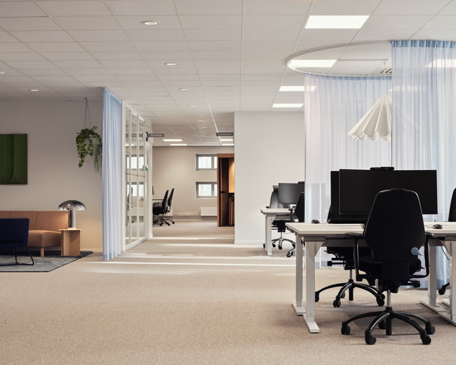 Projektet präglades från starten av en hög hållbarhetsambition, vilket bl.a. återspeglats i valet av textilplattan Tivoli. Dessa plattor är cirkulärt kravställda och har ett av de lägsta klimatavtrycken på marknaden (GWP = 3,10 kg CO₂e/m2) tack vare en hög andel återvunnet material i både lugg och baksida.