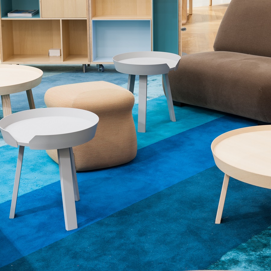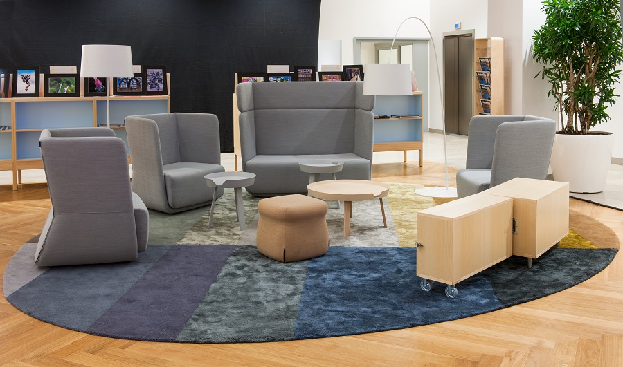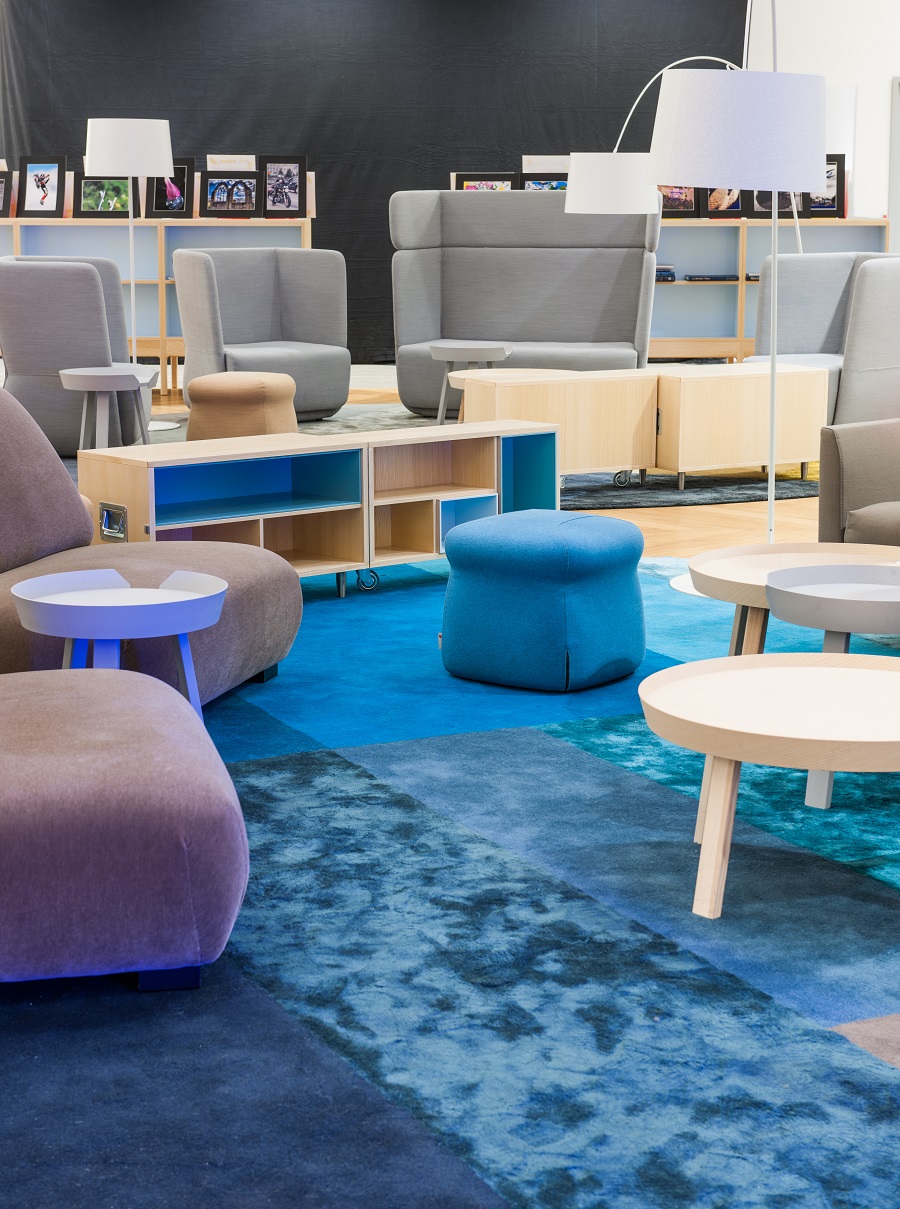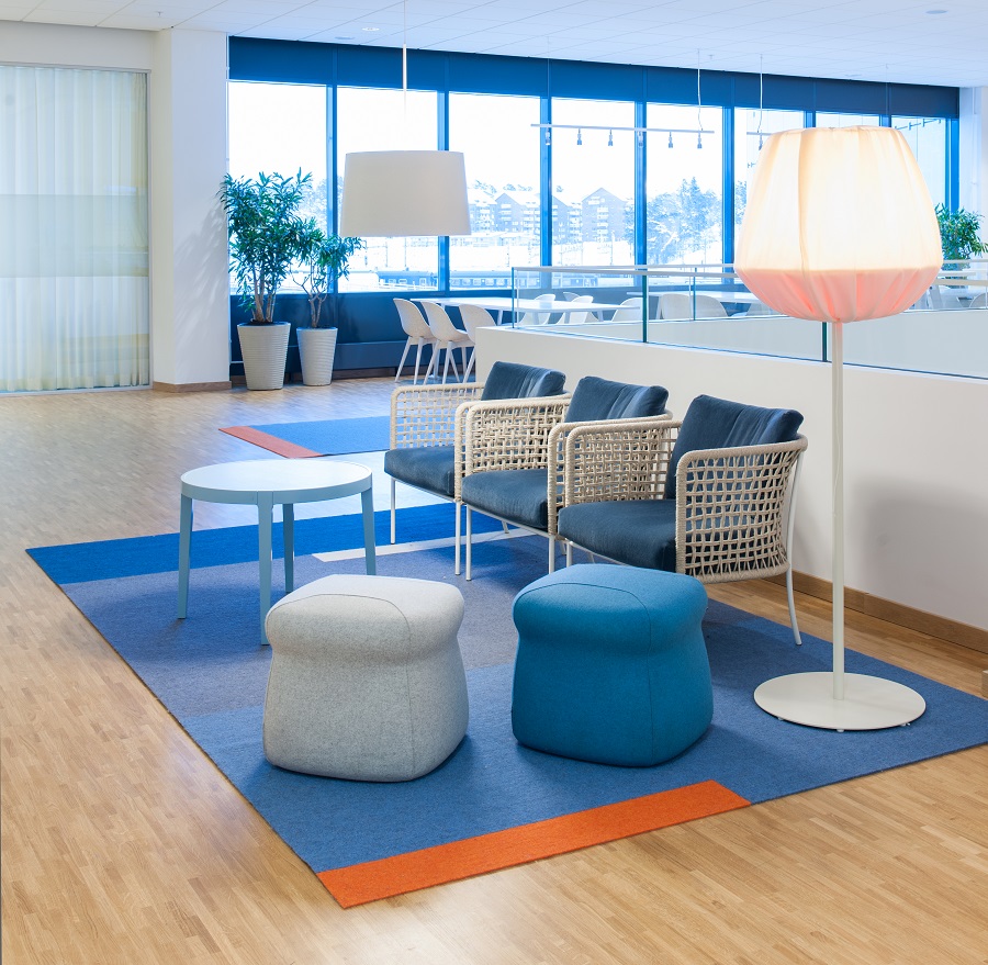 Under några sittgrupper ligger även specialdesignade handtuftade mattor tillverkade i viskos och ull.