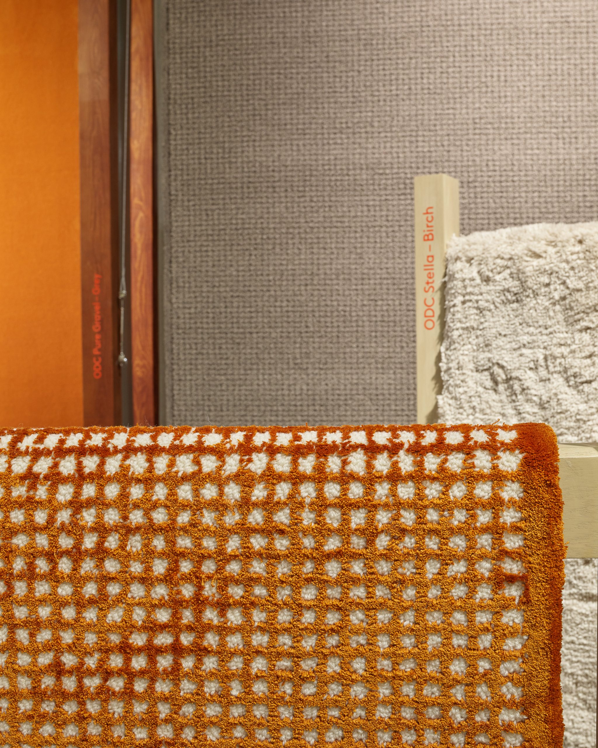 Som en kontrast till förra årets dämpade och mjuka uttryck, har årets monter fått en mer krispig och kraftfull färgpalett. Vi återanvänder den arkitektoniska trästrukturen, designad av Note Design Studio, som skapades utifrån vår önskan att bygga en monter som både är hållbar och flexibel, och kan monteras om i ständigt nya konstellationer. Detta är något vi är mycket stolta över, och vi vill inspirera våra besökare genom att visa hur nya mattor, med helt andra färger och strukturer, kan förnya en grund som är helt densamma – på det hållbara sätt vi alltid strävar efter.